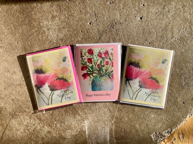 Buy 5 for $22! Mix of printed card with watercolor design painted by Jane Bogue and “Happy Valentine’s Day”.  Includes 5 blank cards and 5 envelopes.