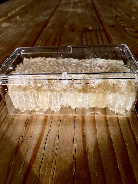 1 wedge of honeycomb with honey inside cells. So sweet and tropical! Raw honeycomb from hives on our farm, managed by Spangle Creek Honey. 4.5″ x 2″ x 2″ container.